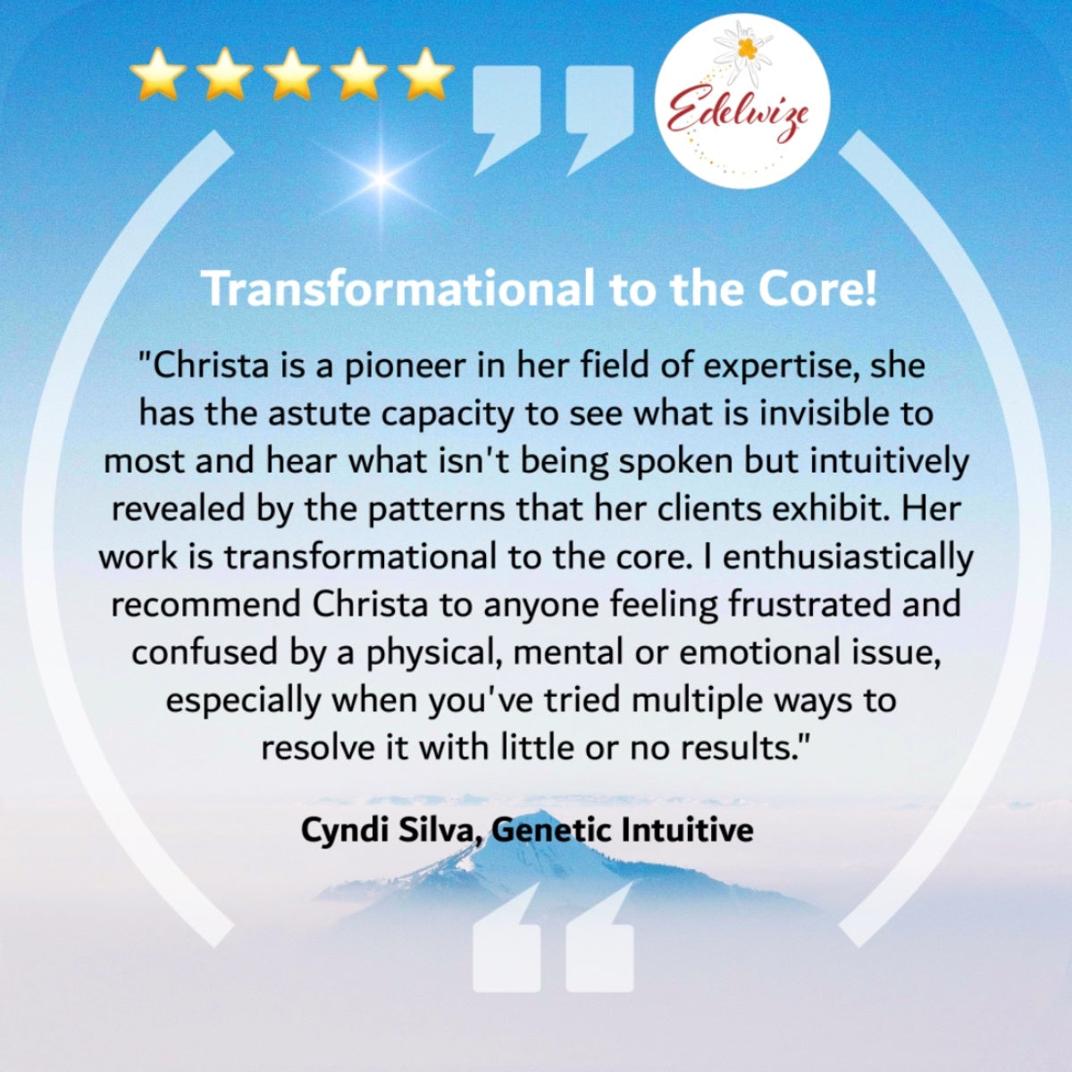 A private North Star Reading with Christa allows you to dive in and address the individual Metaphysical Reason for any imbalance in your life, experience the mind-blowing accuracy of the Edelwize DNA Scan Healing System, and walk away with a clear understanding of what you need to change to permanently transform your body and Soul back to its original wholeness.